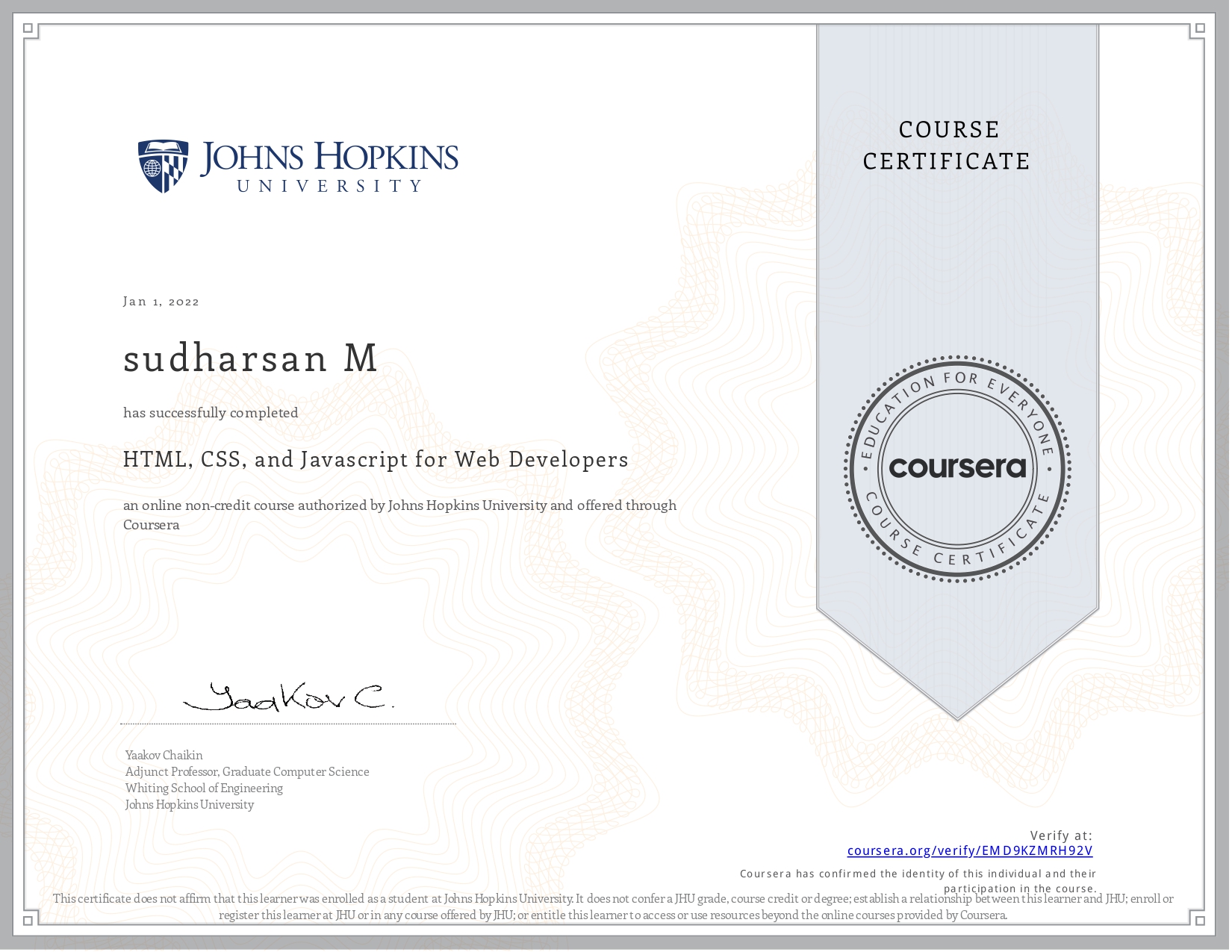I have completed the Coursera course on HTML, CSS, and JavaScript. I am now proficient in developing interactive and dynamic websites with these three technologies.