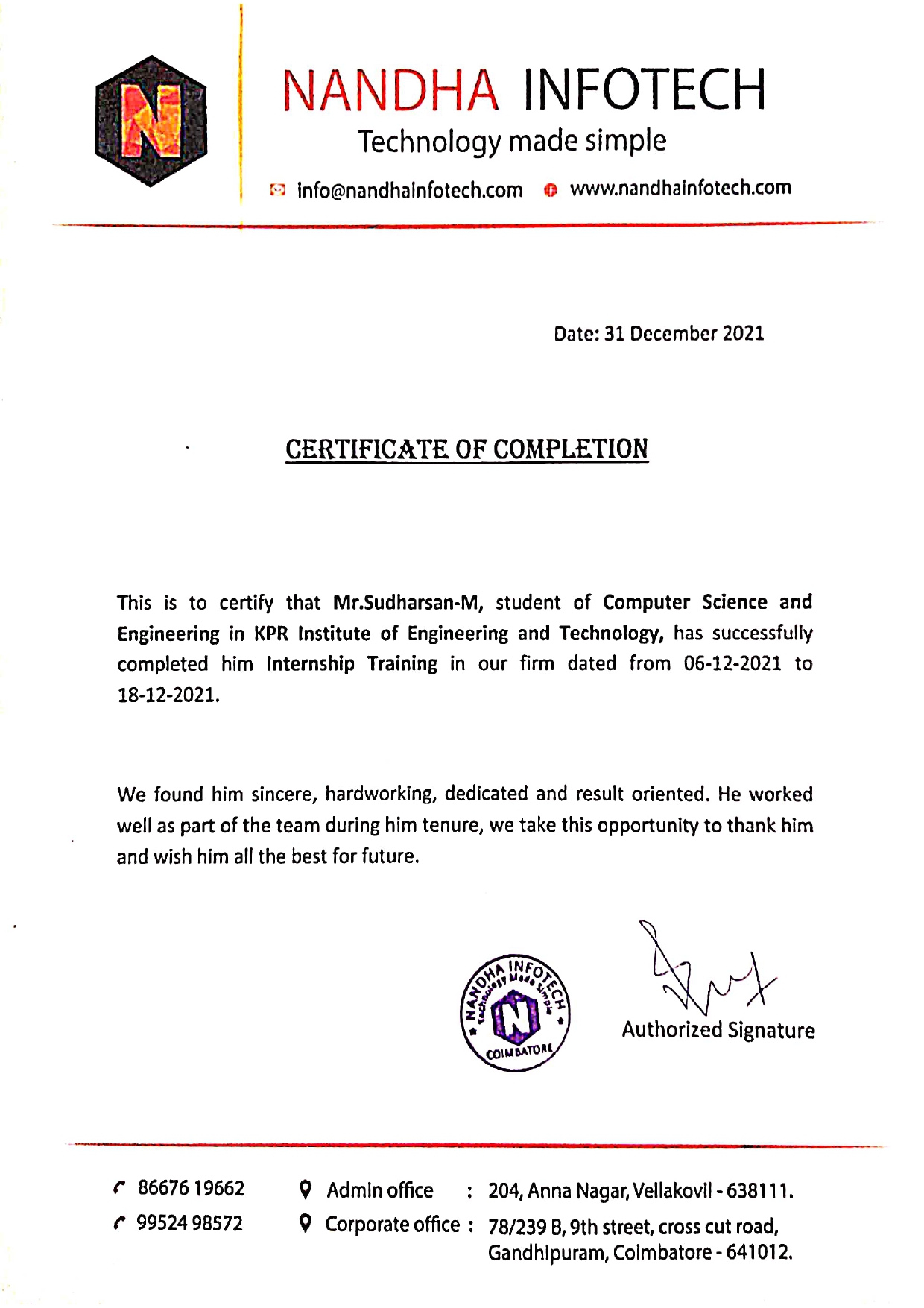 I have completed an internship in web development at NANDHA INFOTECH in Coimbatore. During my time there, I was able to gain valuable experience in this domain and I am looking forward to applying the knowledge I have acquired to my future endeavors.
