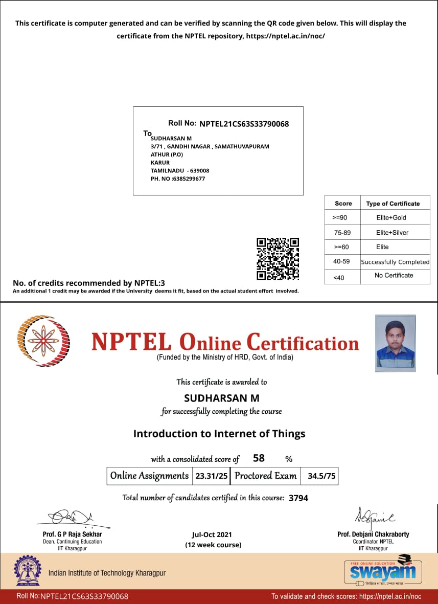 I have completed the Introduction to Internet of Things course offered by NPTEL. This course has provided me with an in-depth understanding of the Internet of Things, its applications, and the potential opportunities it can offer. I am confident that the knowledge and skills I have gained from this course will be of great value to my professional development.