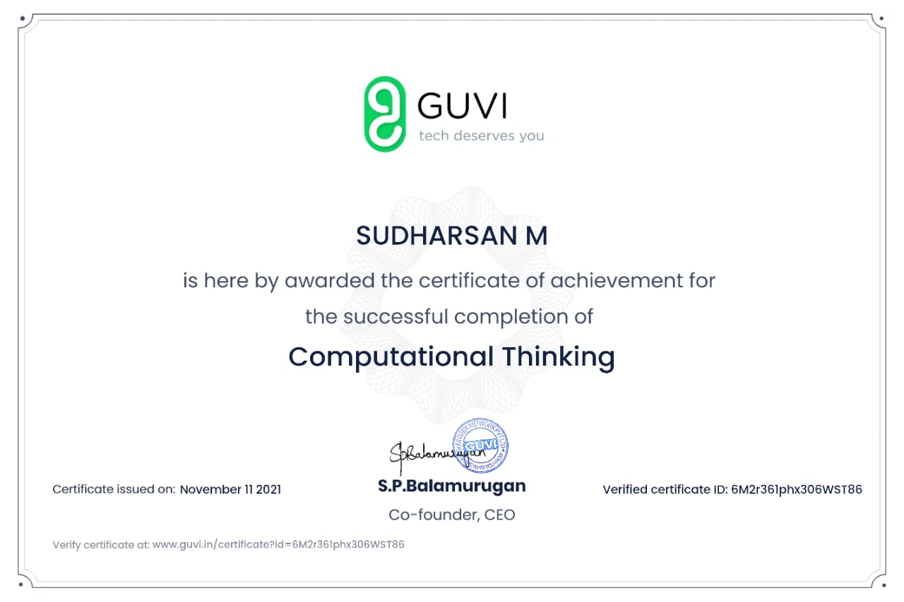 I have completed the Guvi Computational Thinking course and I am proud to have enhanced my skills in this area.