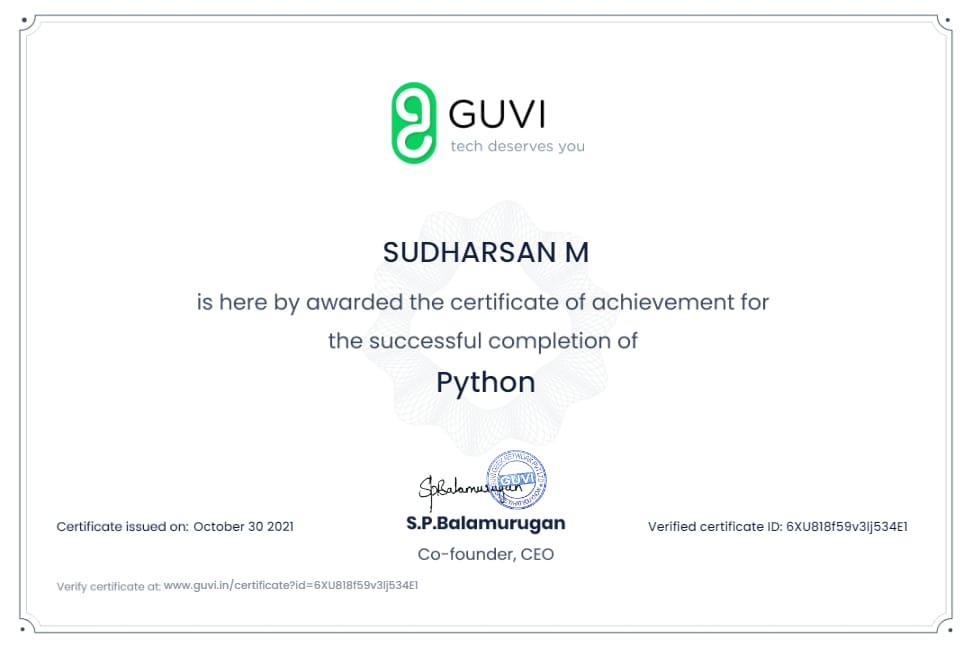 I have completed the Guvi course on Python. I am confident that I have acquired the necessary knowledge and skills to use Python effectively in a professional setting.