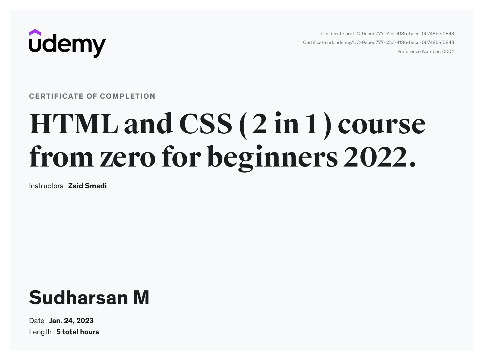 I have completed the Udemy course on HTML & CSS. This course has equipped me with the skills to create a responsive websites.